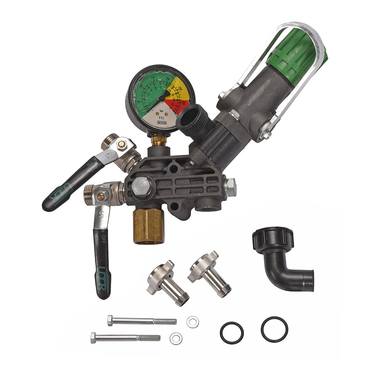 Pump mounted Universal Control Unit with adjustable pressure regulator & manual dump lever with 3/4" female NPT inlet port. Includes two 1/2" ball valve discharge ports & pressure gauge. For use with diaphragm, plunger, piston or roller pumps.
