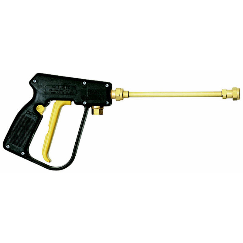 The AA30L-22425 GunJet spray gun (shown with 8" extension) is also available without extension as GunJet spray gun AA30L. Flow rates up to 5 GPM (19 l/min). Maximum operating pressure of 250 PSI (17 bar). Outlet connection is 11/16"–16 TeeJet® thread. Body and trigger molded of tough Nylon. When used with extension, the valve stem extends through the entire extension length for drip-free shutoff immediately behind the spray tip. Accommodates all interchangeable TeeJet spray tips.