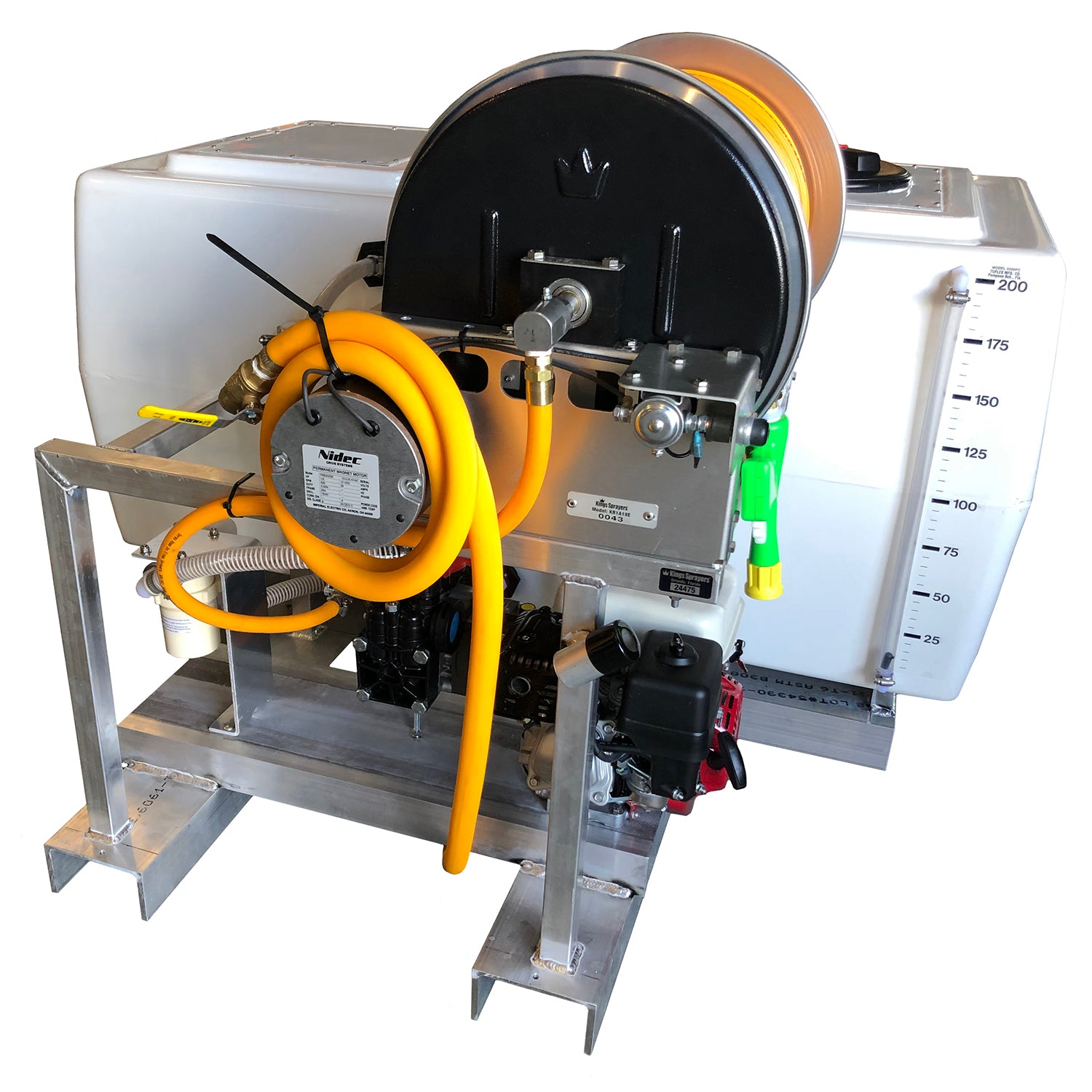 Manufactured with top of the line components and a lightweight corrosion-resistant aluminum frame - this Kings 200 Gallon Skid Sprayer with Fiberglass tank is durable and reliable! This model has 400' of 3/8" ID with the hose reel mounted facing passenger side. Spray up to 9.5 gpm or up to 580 psi depending on your application and use the extra hose length to spray hard to reach areas.