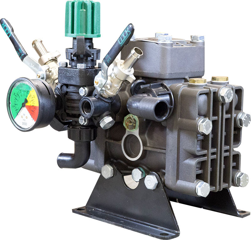 Two diaphragm pump with pulsation dampener & control unit with adjustable pressure regulator, manual dump valve, dual ball valve outlets & pressure gauge.